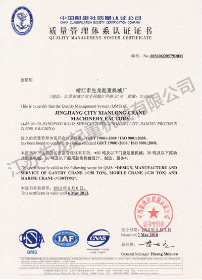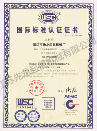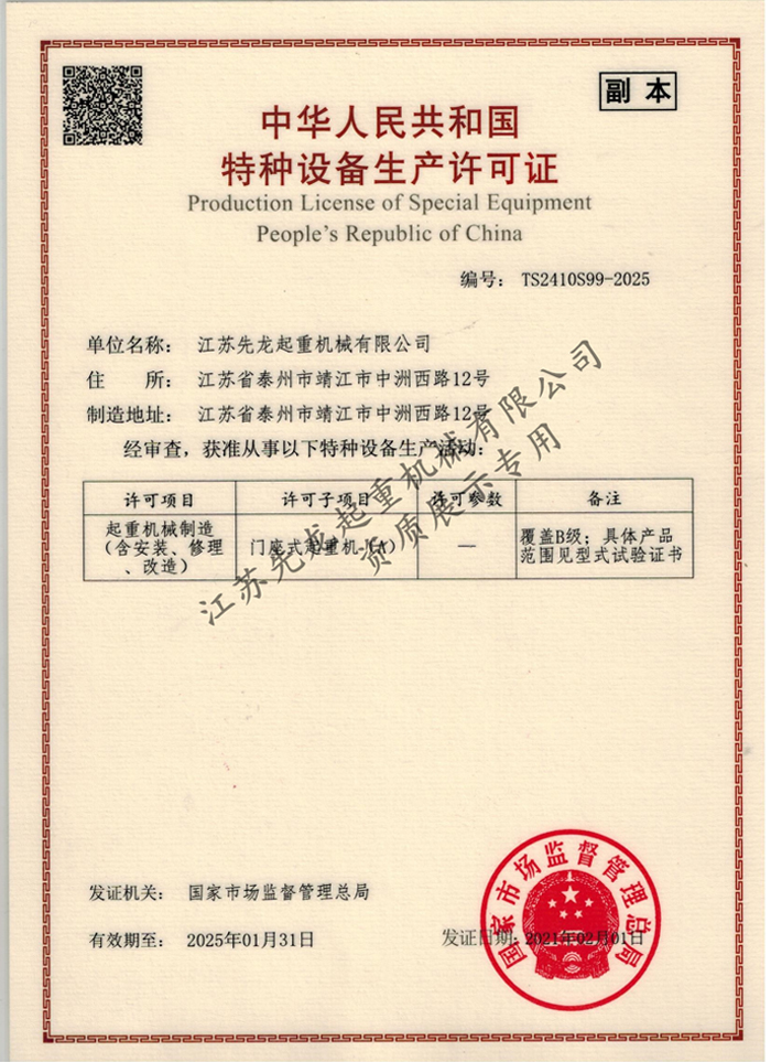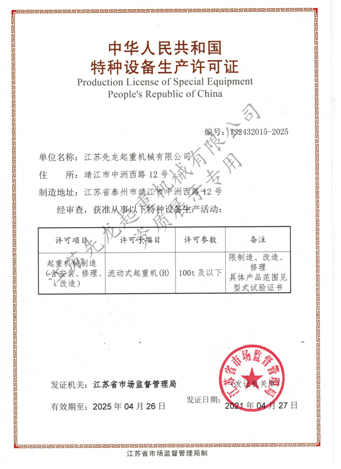 江蘇先龍起重機械有限公司(原靖江市先龍起重機械廠)是改制后的獨資企業(yè),本廠是生產(chǎn)起重運輸機械的專業(yè)化企業(yè),并先后通過了ISO9001:2000質量管理體系認證、獲得國家頒發(fā)的HGQ50T固定式起重機和DLQ20T輪胎式起重機的特種設備制造許可證、特種設備安裝維修改造許可證。